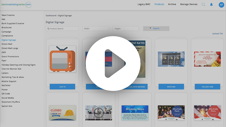 Bank Marketing Center’s Digital Signage enables you to manage your digital displays, such as those in your branch lobbies, directly within the marketing portal. This tool helps you effectively coordinate all your marketing materials from our user-friendly dashboard. Create, schedule, and edit your content – with drag and drop ease.