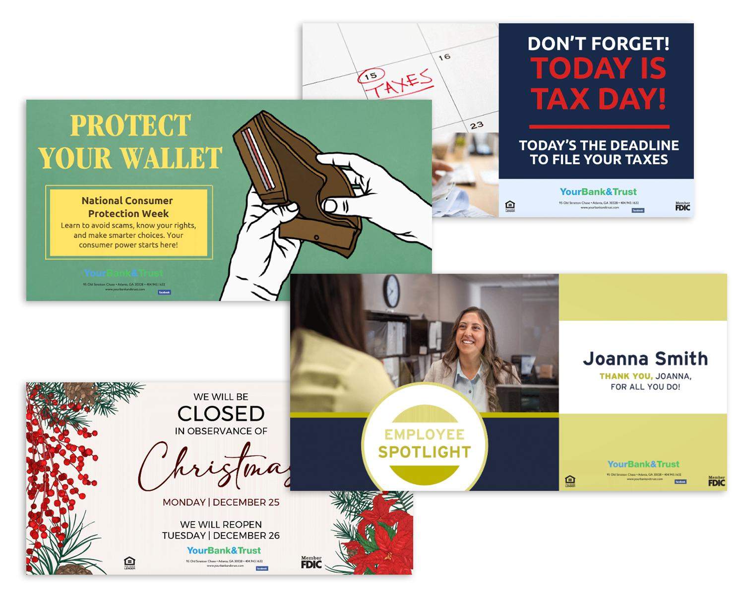 Effectively promote your products and services, cross-sell additional offerings, and keep customers informed about branch hours and community events.